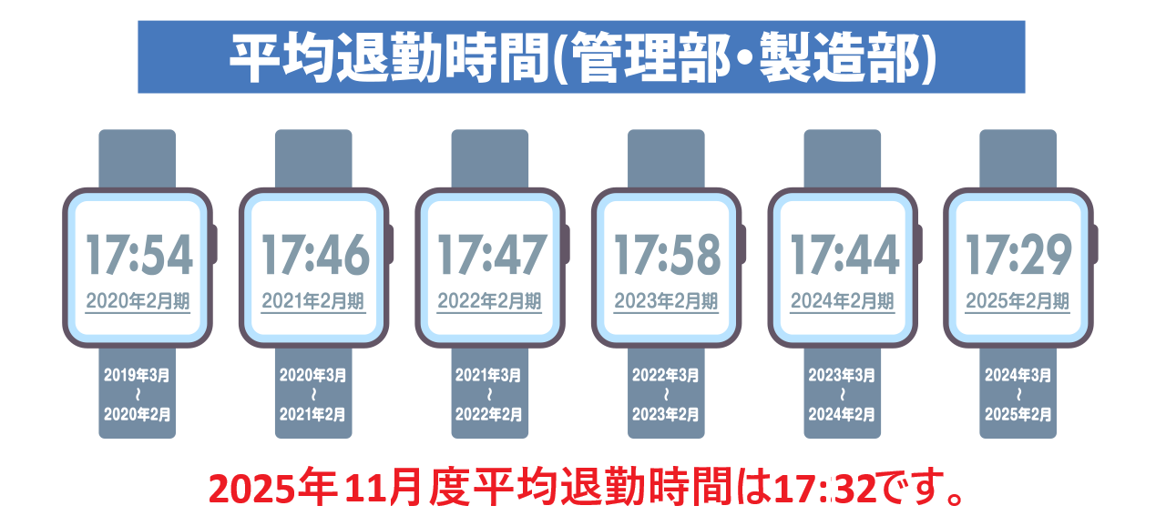 管理部・製造部では社員一人一人の意識や業務効率の改善に取り組んだ結果、年間休日の取得が増えつつあり、平均退勤時間が早くなっています。 フレックスタイム制を導入して16時に退勤できることもメリハリのある勤務につながっています。平均退勤時間17時を目指しています。