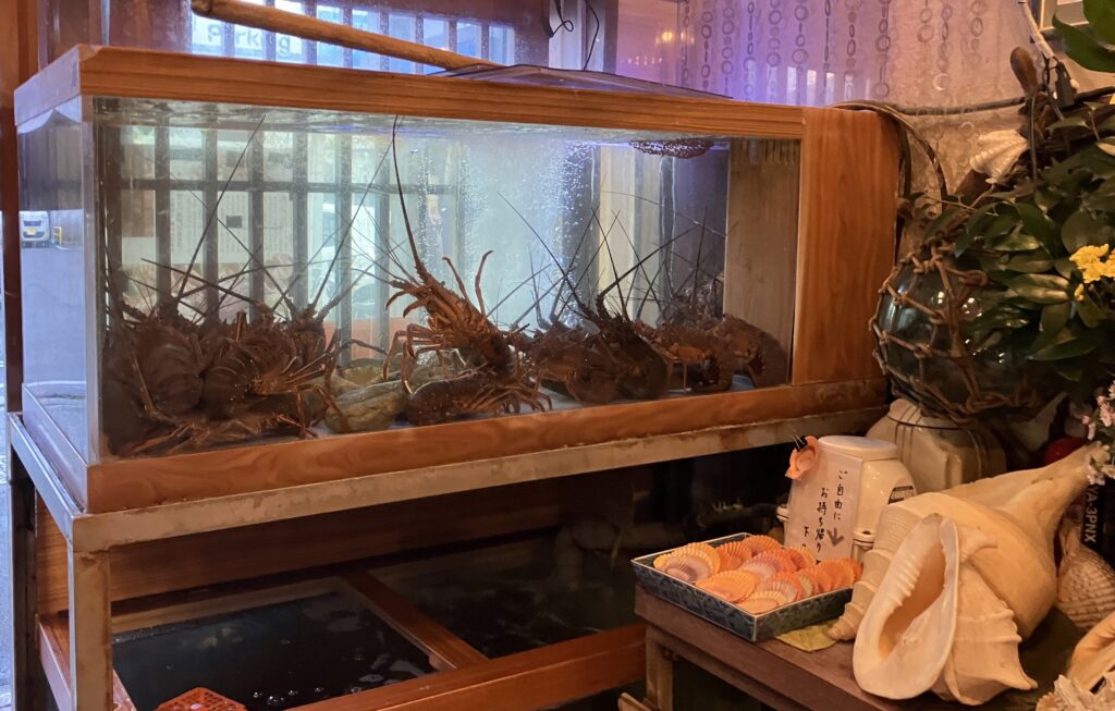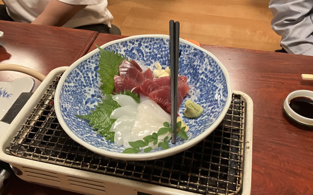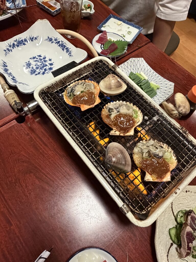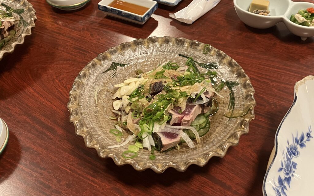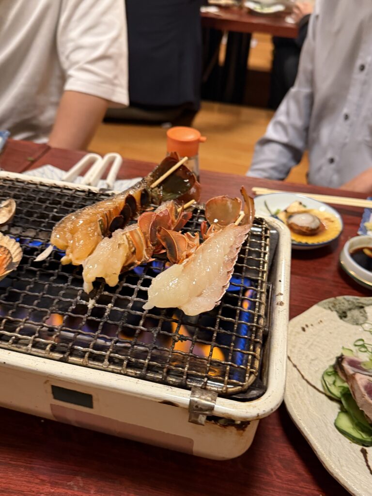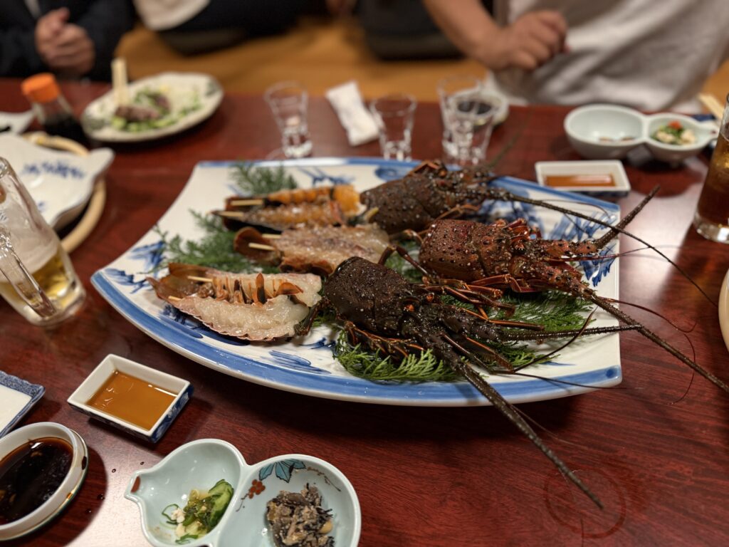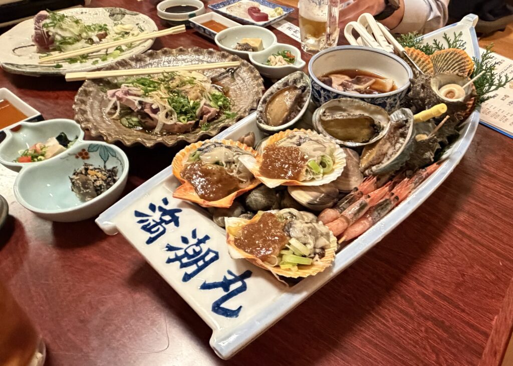 テーブルには、見た目にも迫力のある種類豊富な活貝の盛り合わせ、新鮮なお刺身、高知と言えば外せないカツオのたたき、そしてぷりぷりの伊勢エビなど、海の幸が豪華に並びました。どの料理も素材の良さが際立ち、思わず声が漏れるほどの美味しさでした。
