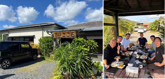 1日目(株)オーシャンズの遠藤社長に挨拶してから島料理・ 鶏飯こころさんに向かいました。奄美大島の気温は11月でも暖か く25度前後で、外の屋根付きテーブルで