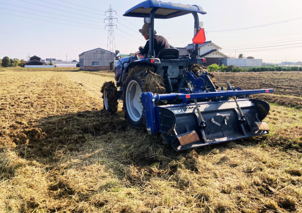 耕起田んぼでは、藁散らしを行い均等に藁を圃場内に拡散させたらトラクターで耕起をしていきます。