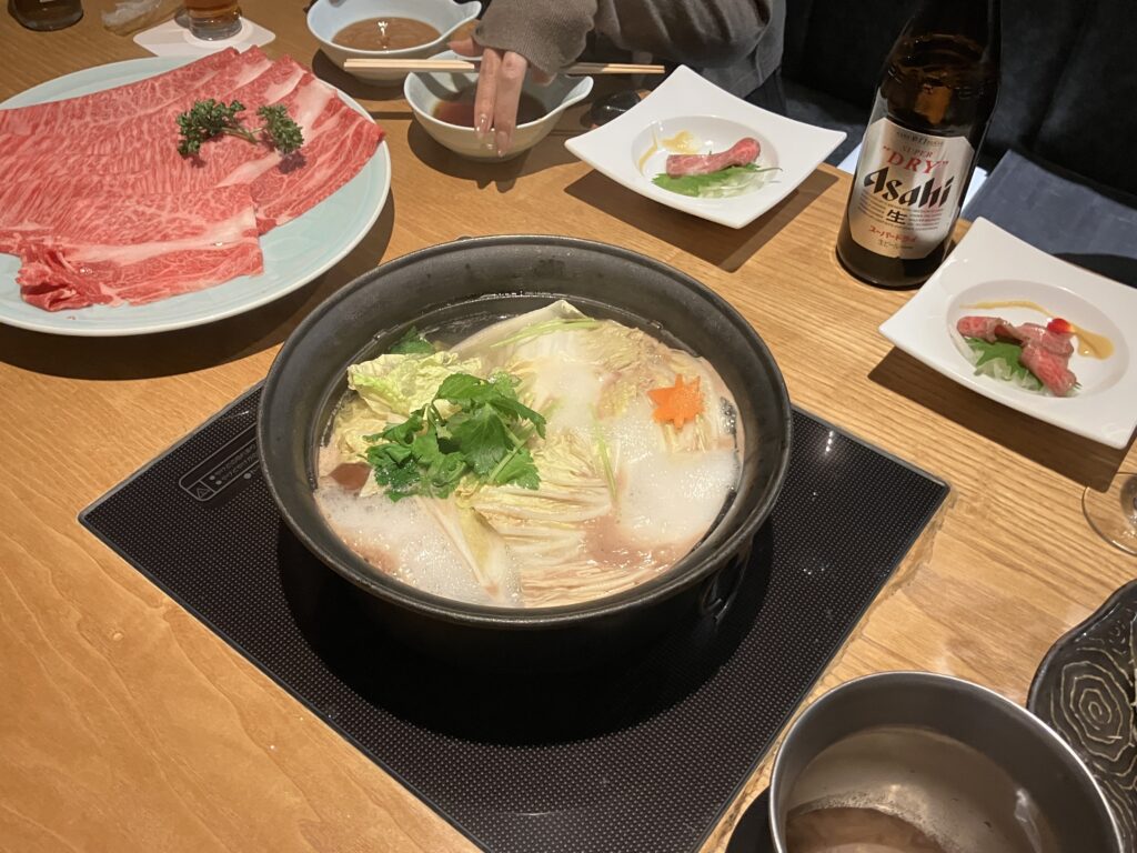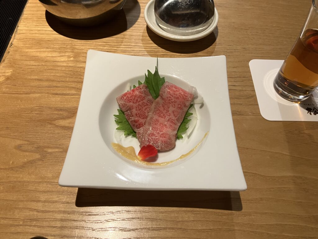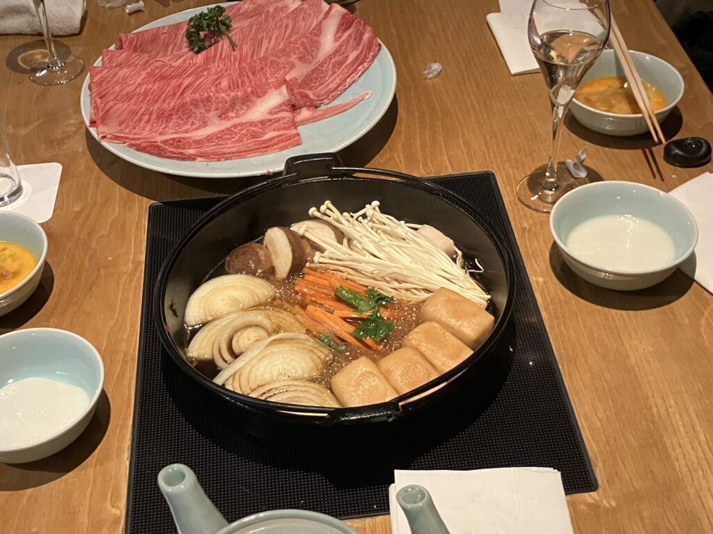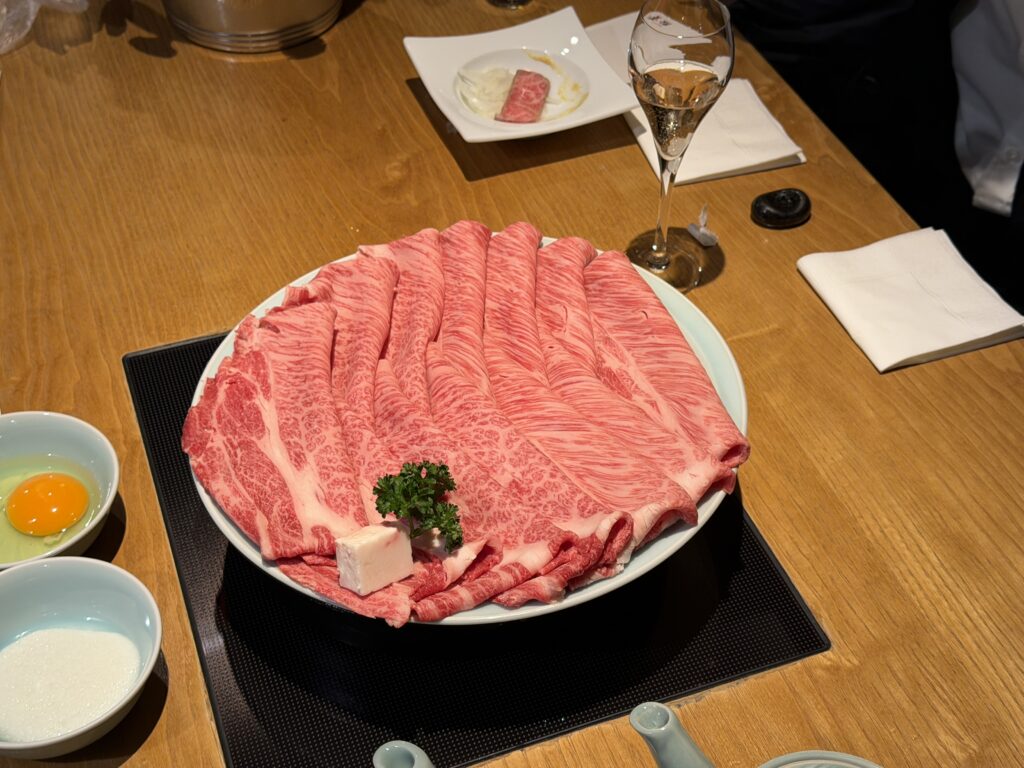 1枚がとても大きなお肉でのすきやきとしゃぶしゃぶは、口の中がとても幸せになり、とてもやわらかく最高の一口でした!おいしいシャンパンに赤ワインなどもいただけて、めったに味わえない最高の食事ができました!