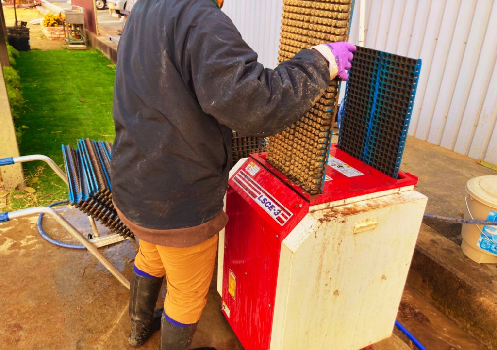 育苗箱専用の洗浄機を活用して洗っていく。