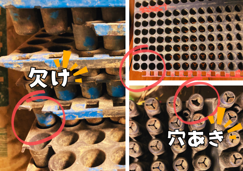育苗箱も劣化して亀裂や穴が開いたもの、先端が欠けてしまったものは破棄していきます。