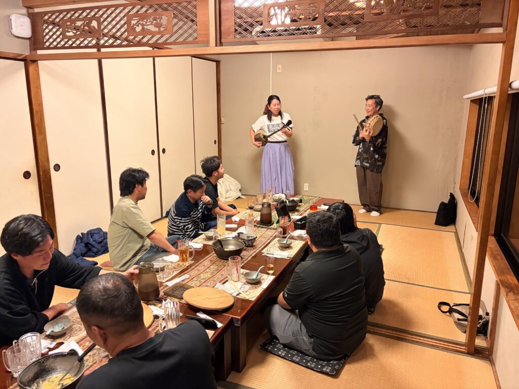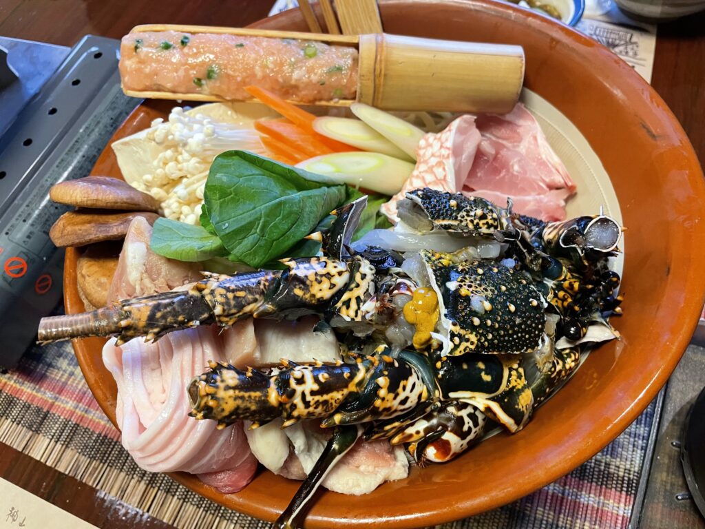 夕食は、ばしゃ山村にて、伊勢海老が豪快に入った海鮮鍋に舌鼓を打ちながら、島唄と三線の音色に酔いしれて奄美の海とサンセットを目に焼き付けました。