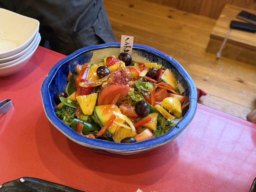 前菜のサラダはフルーツが入って色とりどり、目でも楽しめる逸品です。