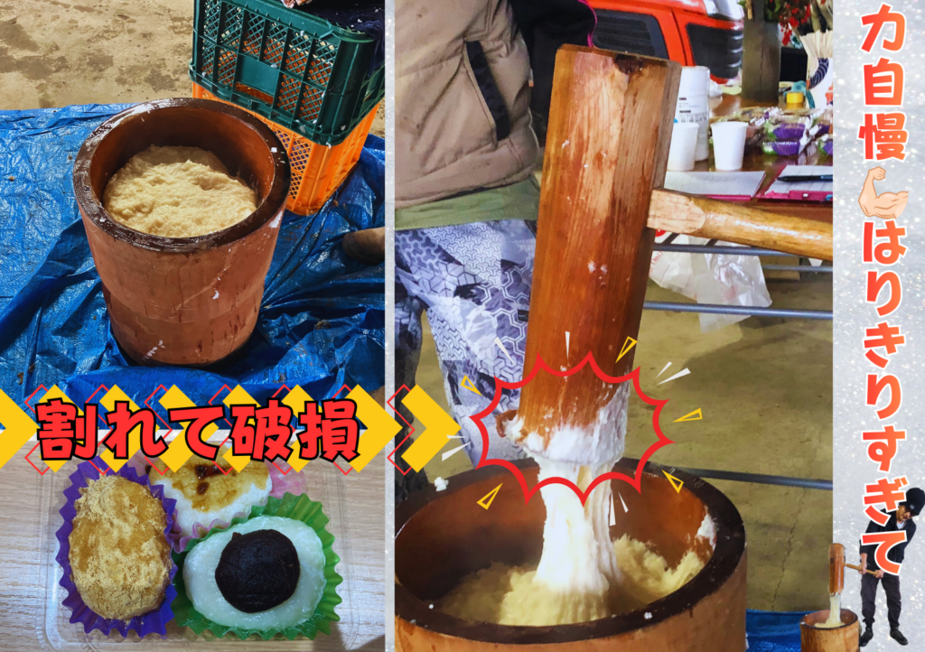 実は、餅つき最中に杵の先端が割れてしまうトラブルが発生。