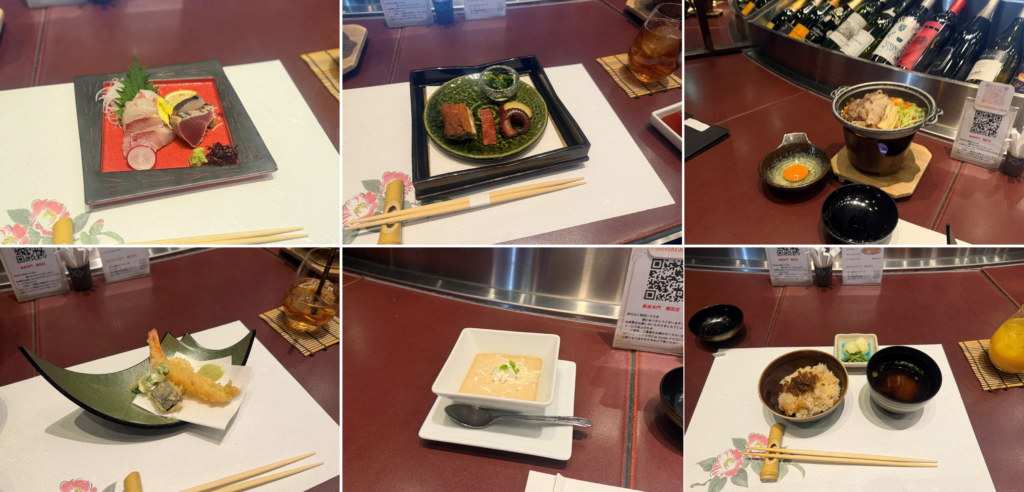 新鮮なお野菜を使った前菜、旬なお魚の新鮮なお刺身、海鮮天婦羅、すき焼きなど美味しい料理が続々と