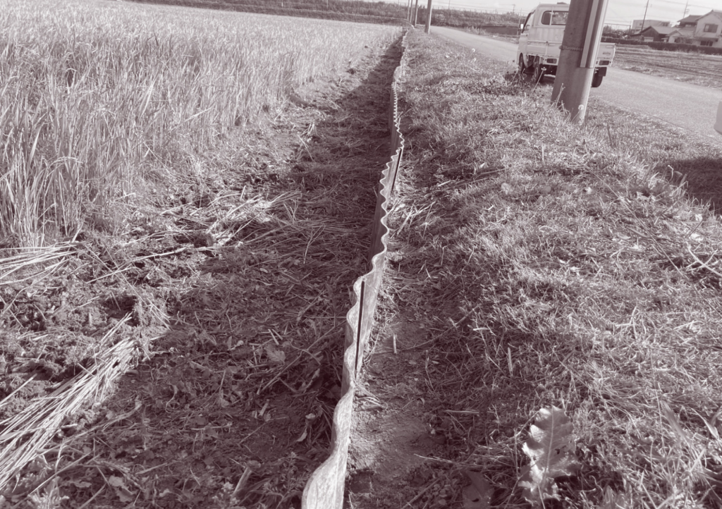 暖かくなると、畔から田んぼの中へ雑草が侵入しようとしますが、この板が防波堤になってくれます。