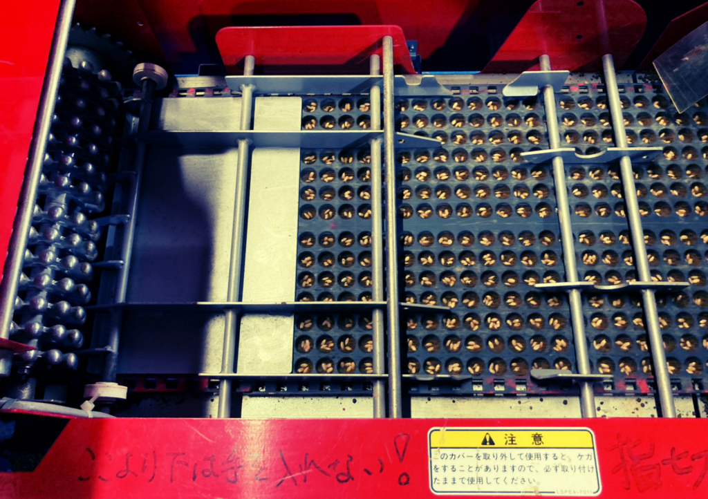 1つの穴に2~3粒。これが意外と難しい!機械の機嫌を伺いながら、一粒入魂で調整します。