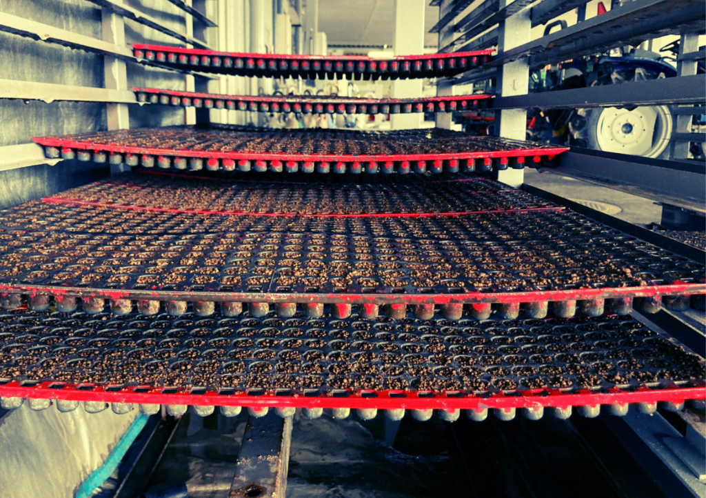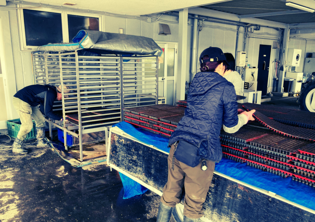 ここで芽が出すぎてしまうと、次の工程の苗箱運搬で芽を痛めてしまうからです。